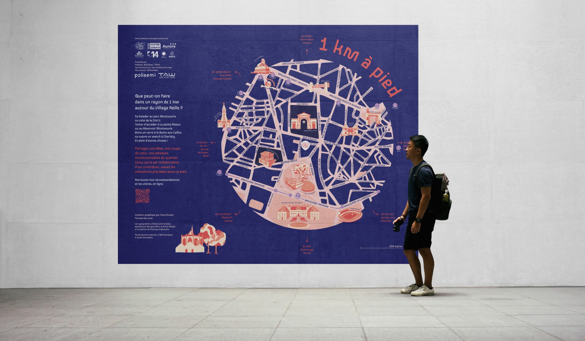 Réalisation d’une carte du quartier autours du Village Reille, tiers-lieu du XIVe arrondissement parisien. Cette cartographie murale est destiné à devenir interractive, les occupants du lieu et son public étant amenés à y épingler leurs adresses préférées.