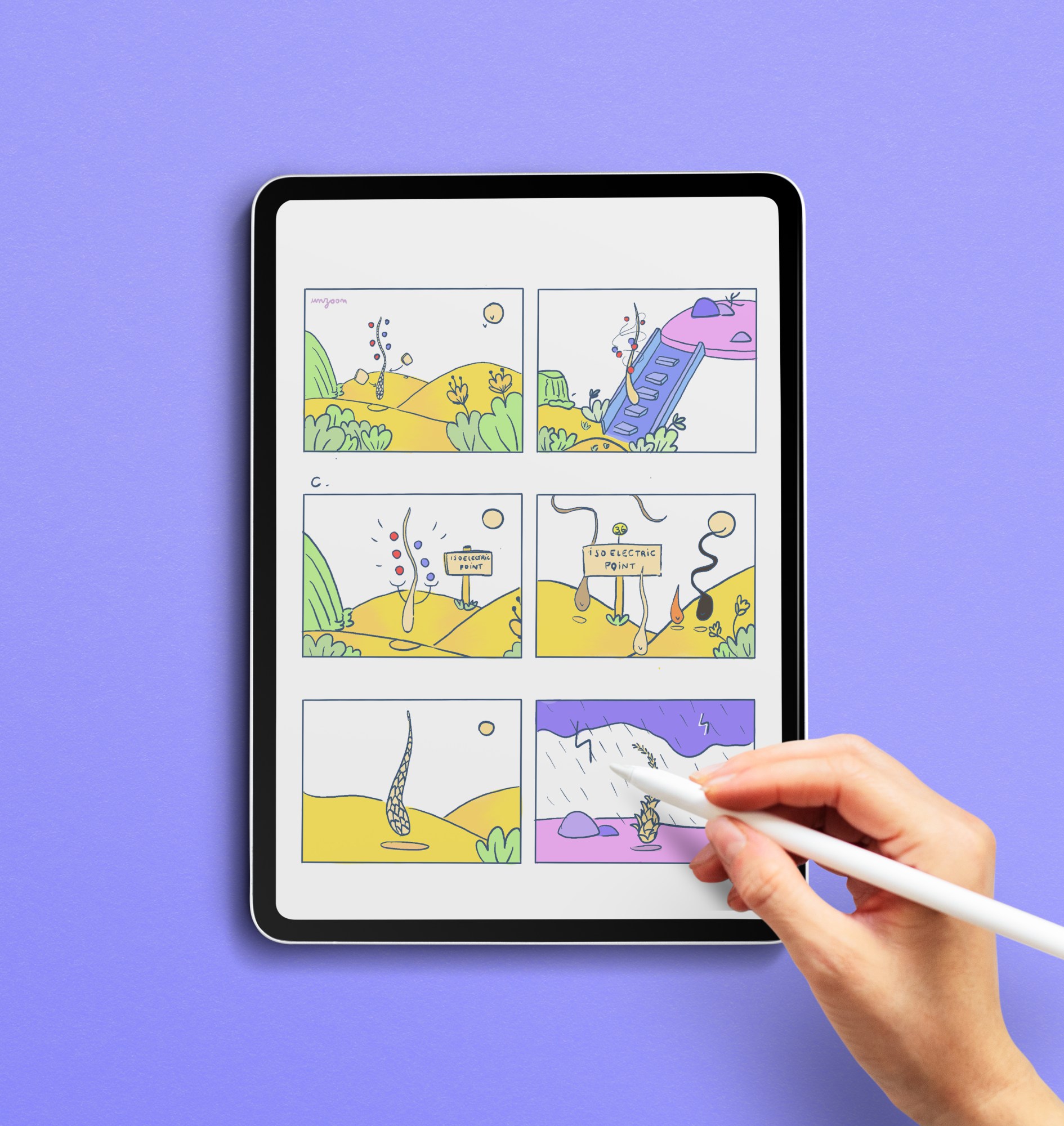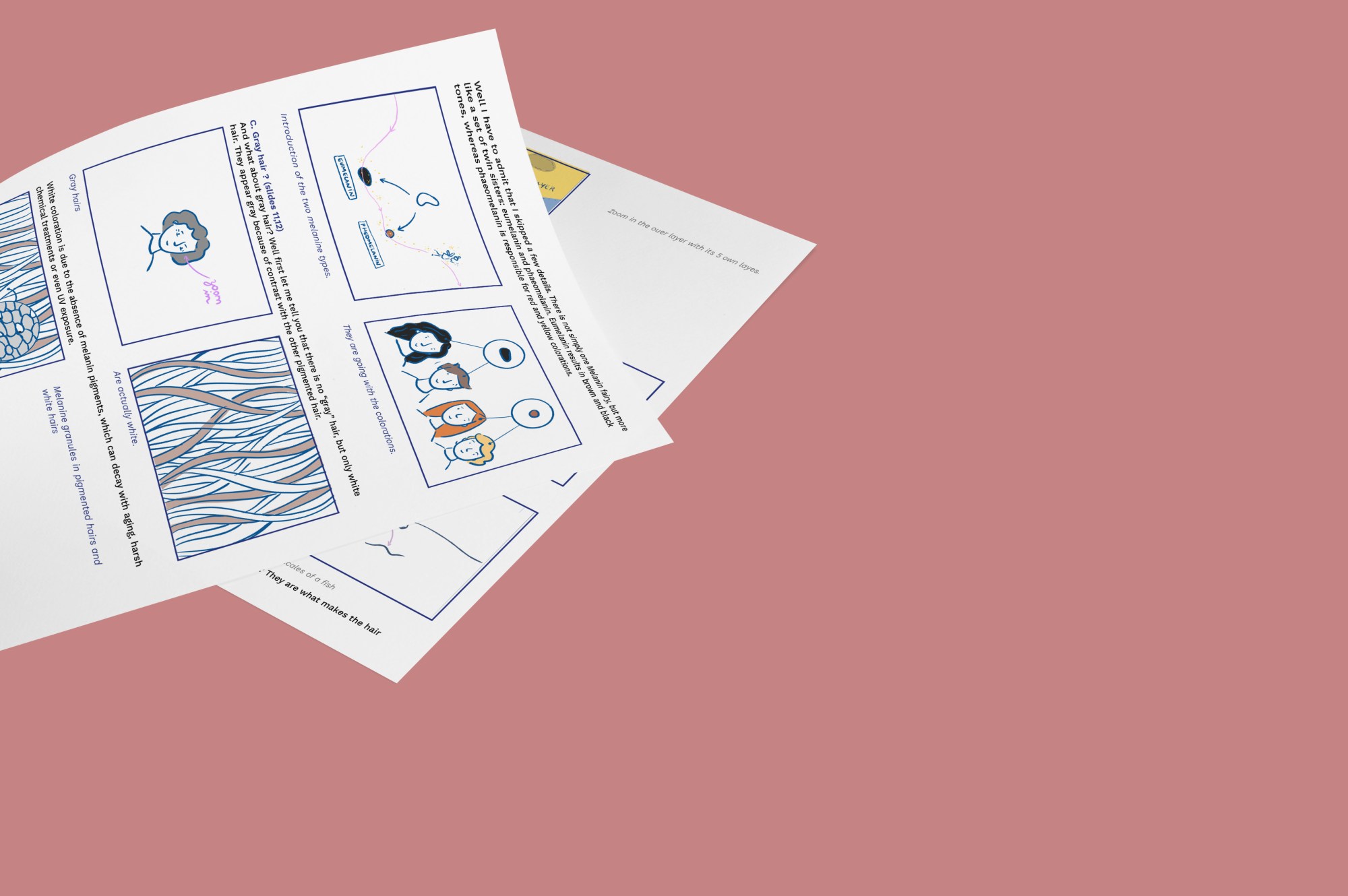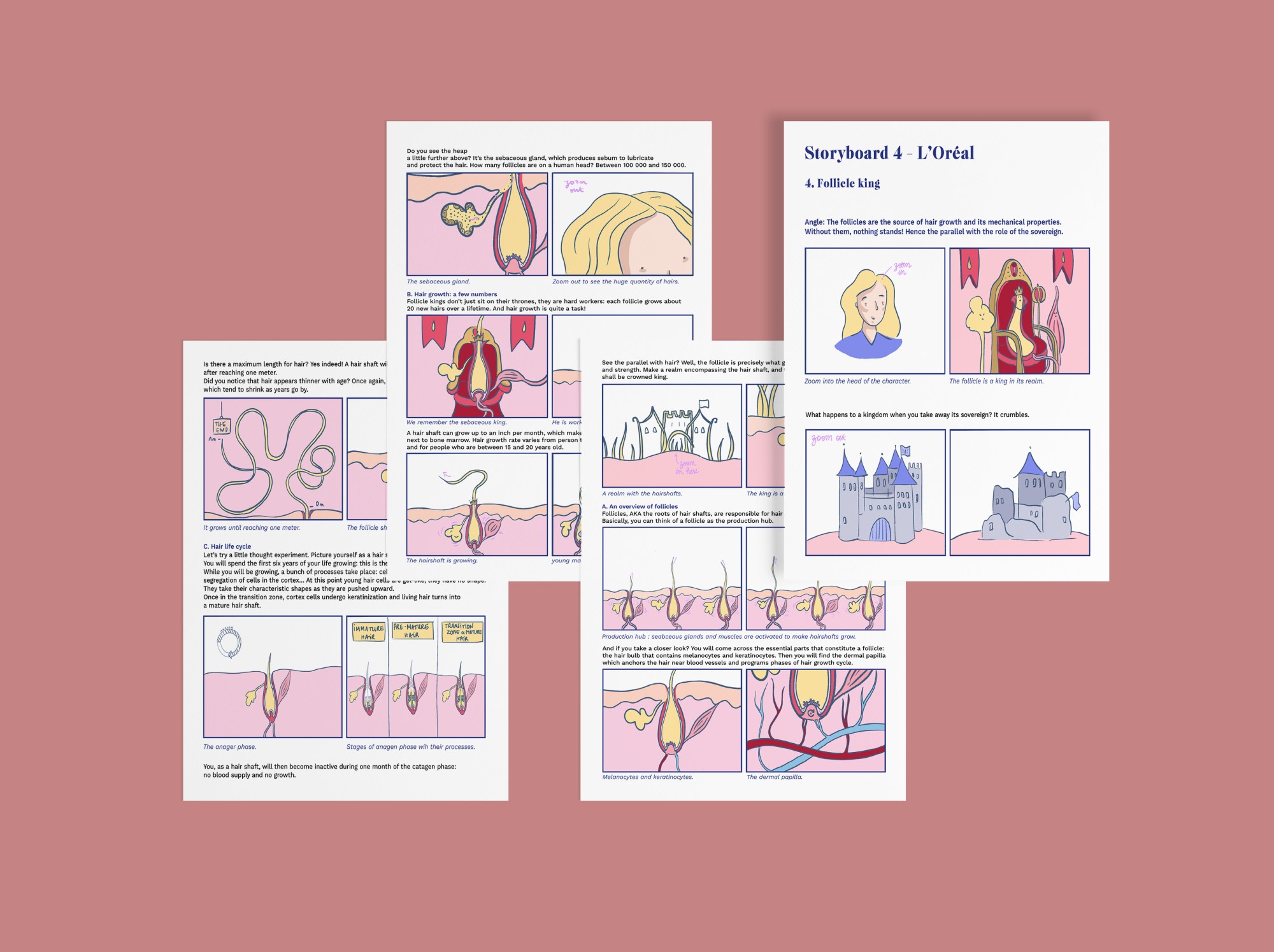 Réalisation de storyboards didactiques sur la science des cheveux, observés au niveau microscopique. Conception pour l’agence Bright, dans le but de créer des vidéos pédagogiques pour l’Oréal.