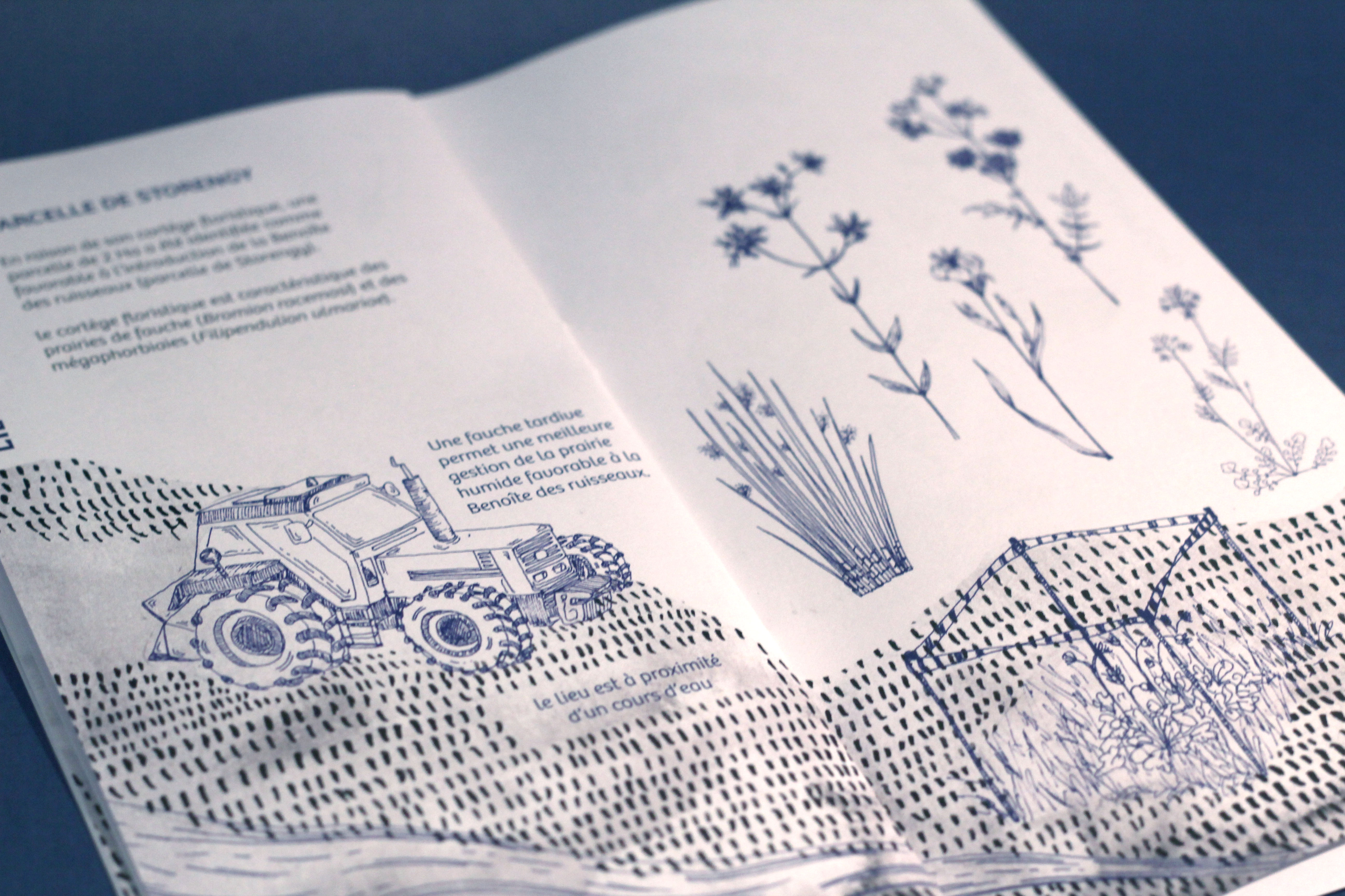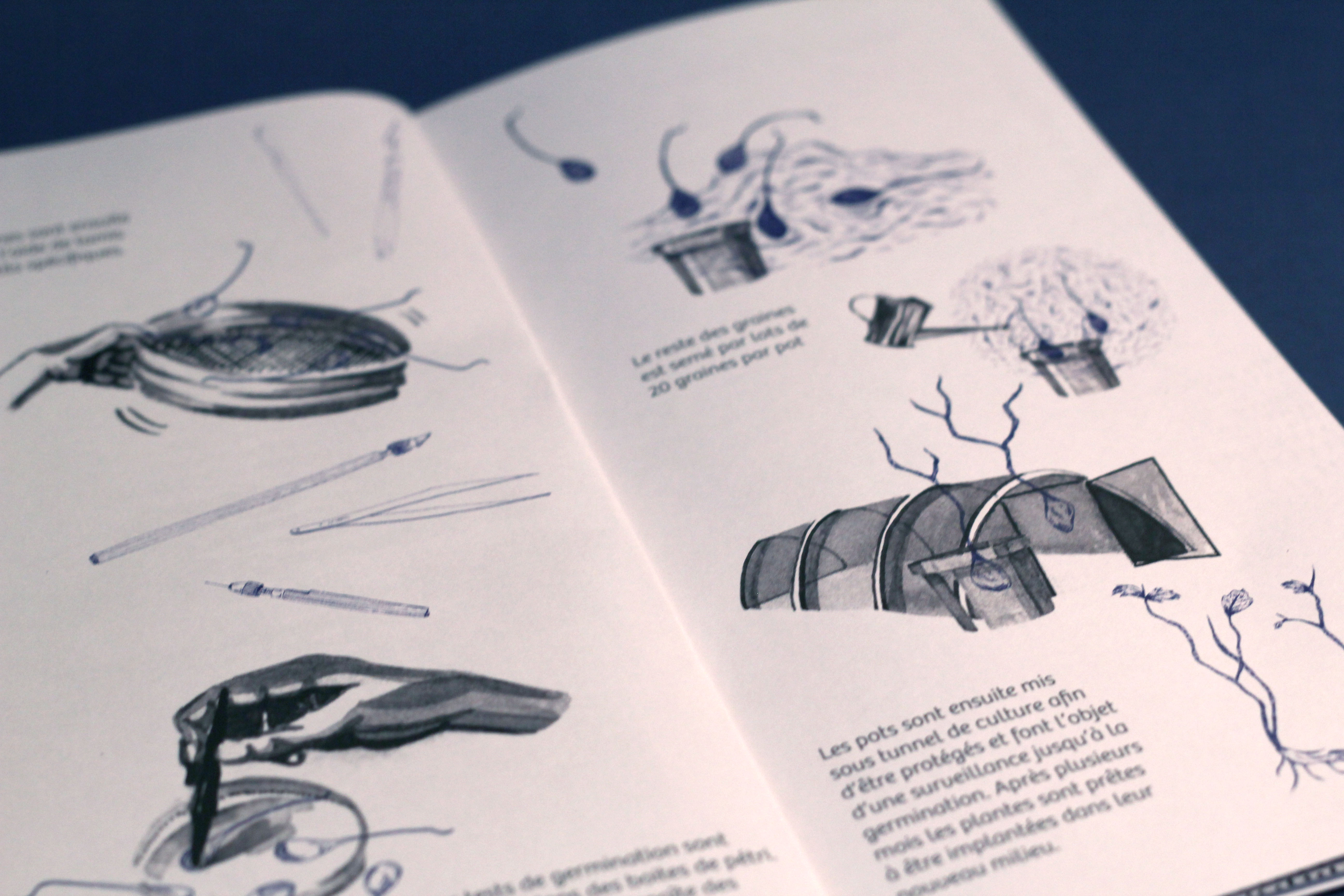 Conception graphique et illustration d’une édition sur la conservation d’une espèce végétale menacée en Ile de France, la Benoîte des ruisseaux ou Geum rivale.